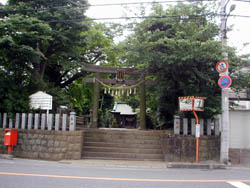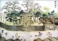 18 八坂神社![]() ![]() | 往還を更に進み椎津川を渡ったところに八坂神社がある。 祇園社と云い、建速須佐之男命を祀る郷社である。崇神天皇の御代に須賀山(城山)に祀られて、須賀宮と名づけられていた。は稲田の宮とも云う。その後、今の土地に遷祀した。慶安二年十月十七日徳川家光が神領十石二斗を寄進する。 毎年七月九日大祭を行い、神輿の渡御をおこなっていたが、明治四十四年より七月二十ニ日に執り行うこととした。 古式に則った左源の種蒔き神事では、天狗のお面を被り、鍬で田畑を耕す真似をし、観客に向けて種を播く。観客は争ってその種を拾い、これを混ぜた種を畑に播き、その年の豊作を祈願した。 境内は平坦で木更津街道より五尺高く、南側は城山、他の三方は平坦で市街に続き樹木は見られない。 本殿は木造平屋茅葺・床下四尺・間口約三間・奥行約二間・左右に回があり、周囲に神垣をめぐらす。拝殿木造平屋茅葺・間口四間半。奥行三間半。 社前に神木の大銀杏樹があり、樹齢数百年と云われている。 (市原郡誌より) 上:明治期の八坂神社 広瀬蘆竹画 (姉崎町年中行事より) |